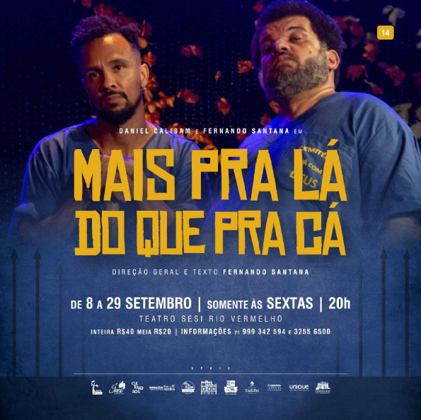 Dois coveiros têm a rotina totalmente transformada pela exigência inusitada de uma falecida: enterrar o caixão em pé. A curiosidade sobre o inusitado pedido e sobre o que há dentro do caixão faz com que a dupla tenha uma trajetória repleta de surpresas, algumas delas desastrosas. Recheado de astúcia e bom humor, o espetáculo "Mais Pra Lá do Que Pra Cá" reestreia no dia 8 de Setembro (SEXTA), no teatro SESI-Rio Vemelho, em Salvador. Os ingressos custam R$ 40 (inteira) e R$ 20 (meia).