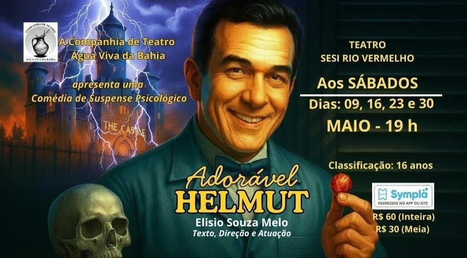 “ADORÁVEL HELMUT” uma comédia de suspense psicológico, escrita e dirigida por Elisio Souza Melo, que emociona e diverte o público que gosta de um bom espetáculo, estreia nos palcos de Salvador. Único espetáculo na atualidade que discorre sobre pessoas frias, insensíveis, manipuladoras, transgressores das regras sociais, impiedosas, imorais, sem consciências. Esses “predadores sociais” com aparência humana estão por aí, misturados conosco, incógnitos, infiltrados em todos os setores sociais e em todas as camadas da sociedade. Aborda conjuntamente temas como: política, homoafetividade, saúde pública, poder estabelecido, o dia a dia de um “Castelo” de Segurança Máxima, violência psicológica e simbólica com muito humor inteligente.